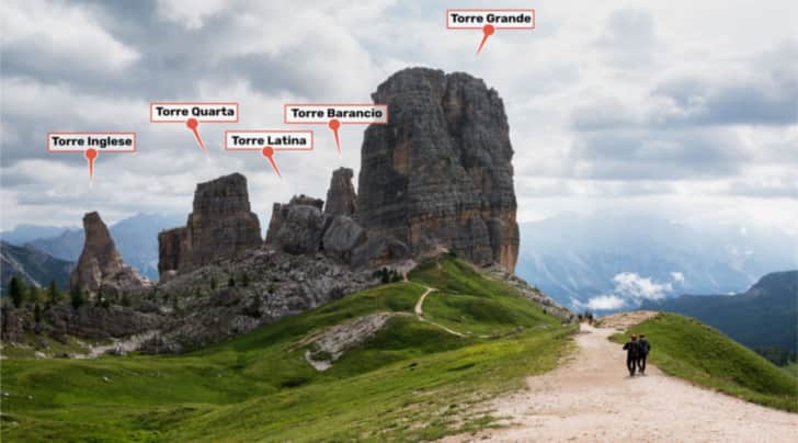 Cinque speroni di roccia dolomitica, ognuna delle quali ha un loro nome: