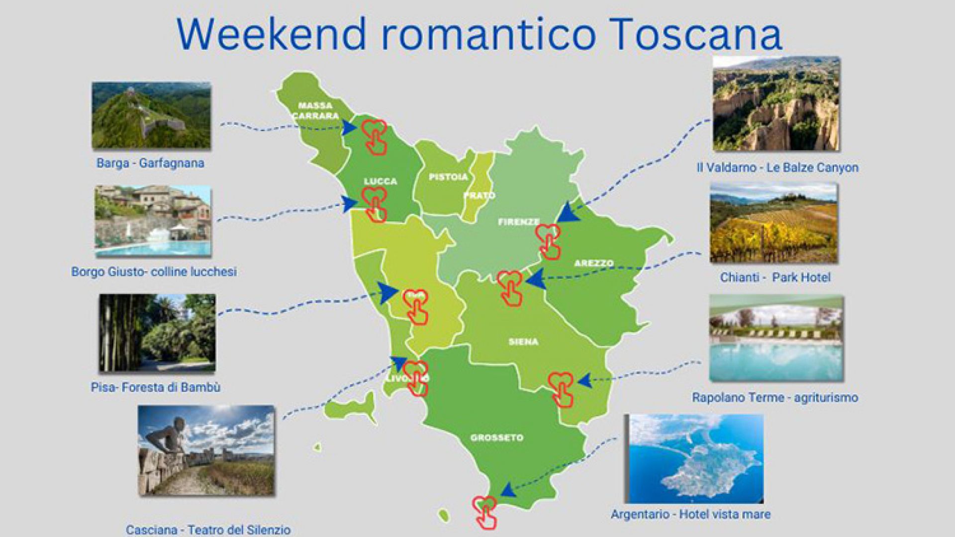 Partiamo da un punto fondamentale, ovvero ovunque vi porti il vostro fine settimana in toscana, sarà assolutamente necessario conoscere bene il luogo che avete scelto. Questa piena consapevolezza del luogo, farà apparire ancora più romantica la vostra scelta, perché si capirà in modo chiaro che dietro c’è uno studio, un impegno interamente dedicato a sorprendere il vostro partner.