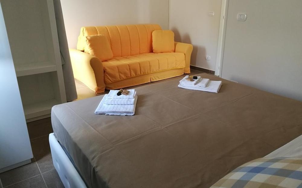 Gli appartamenti trilocali, con occupazione 2/3/4 persone, sono dotati di zona giorno con angolo cottura e divano letto, servizi privati, asciugacapelli, camera matrimoniale, camera con 2 letti singoli, aria condizionata, televisione, collegamento internet Wi-Fi e cassaforte.