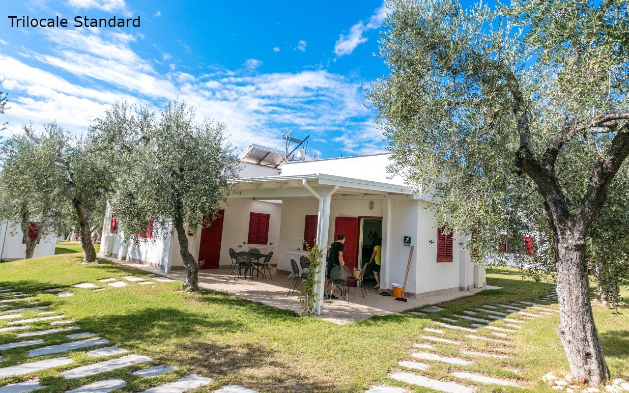 Gli appartamenti Trilocale Standard (ca. 26 mq), si trovano a ca. 300 m dal mare e sono dotati di servizi privati, soggiorno con angolo cottura e frigo con cella freezer, camera da letto matrimoniale, cameretta con letto matrimoniale (chiusura porta a scrigno), aria condizionata e TV, patio esterno con gazebo in legno, tavolo e sedie.