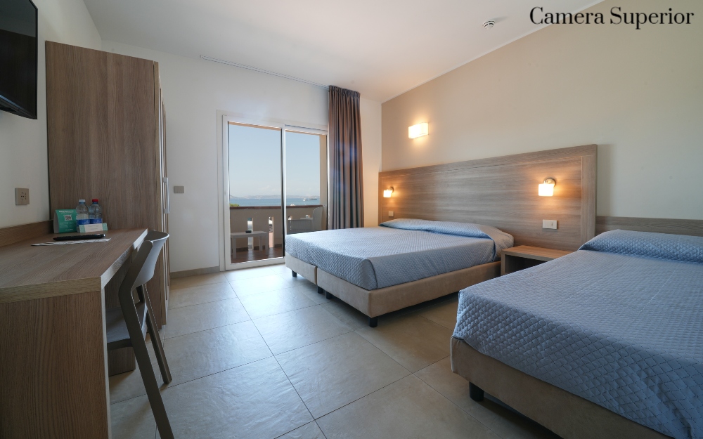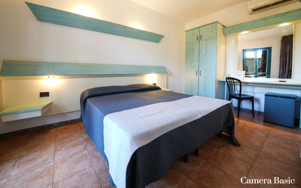 Le camere, tutte dotate di aria condizionata, tv, mini-frigo, asciugacapelli e servizi, si suddividono in camere Basic con arredi essenziali e camere Superior, dotate di cassaforte, completamente ristrutturate e rinnovate. Le camere Superior sono distribuite tra la zona “Limoni” e la zona “Piscina”; le camere Basic sono situate nella zona “Pineta” in villette e piccole costruzioni immerse nel verde e nell’ombra degli alti pini, separate dal corpo centrale da una strada a fondo chiuso. Sono disponibili camere doppie, matrimoniali, triple, quadruple e comode “Family” 4/5 posti letto, composte da due camere e un bagno con relativo supplemento.