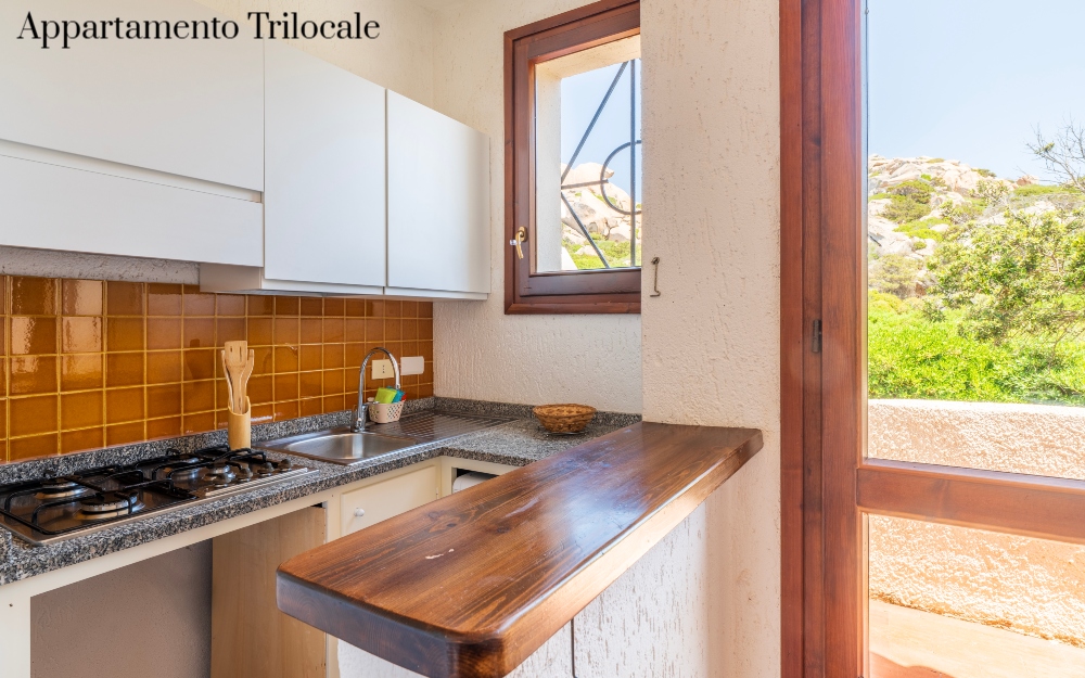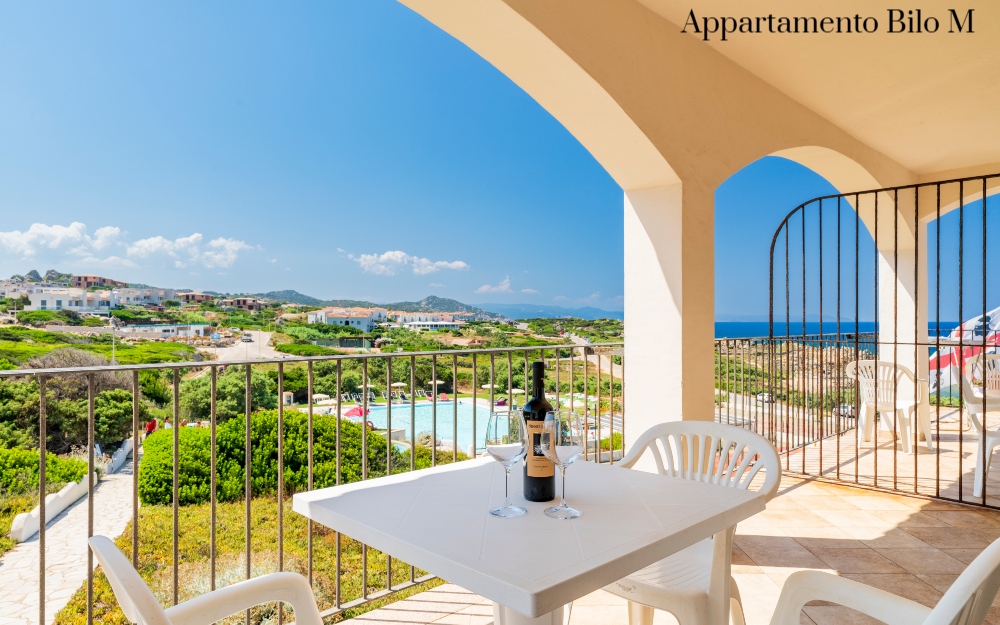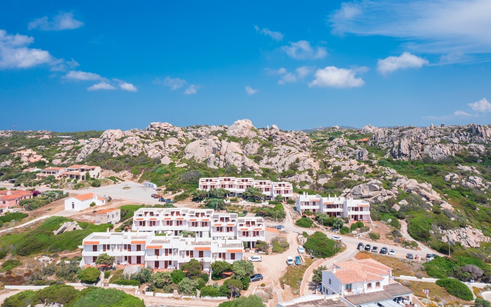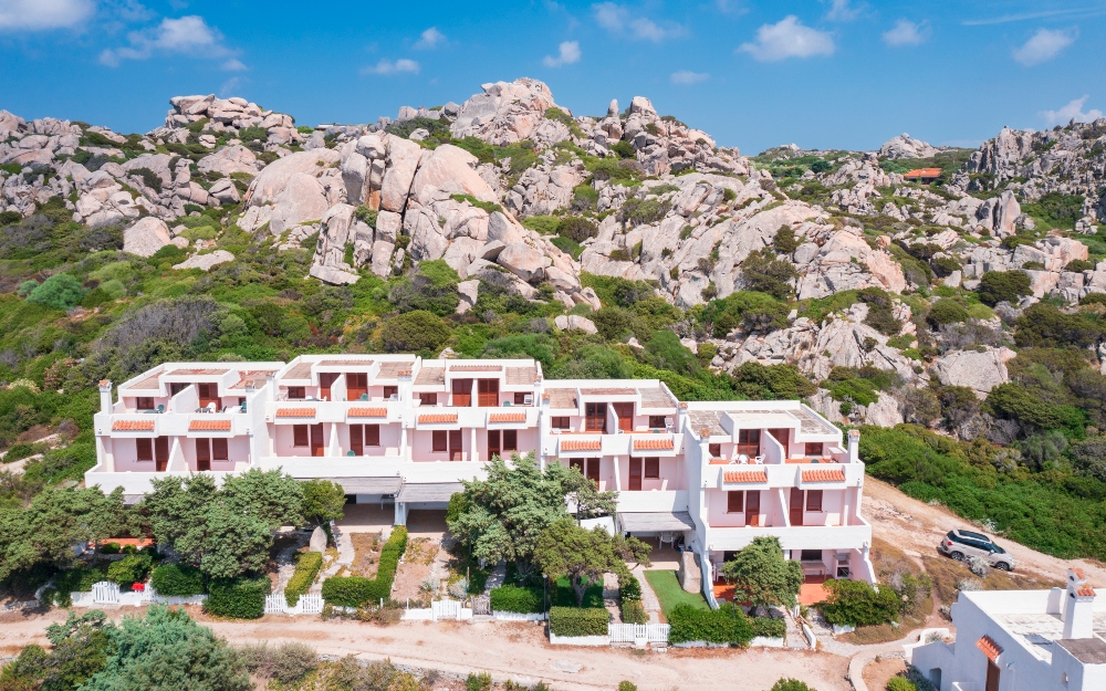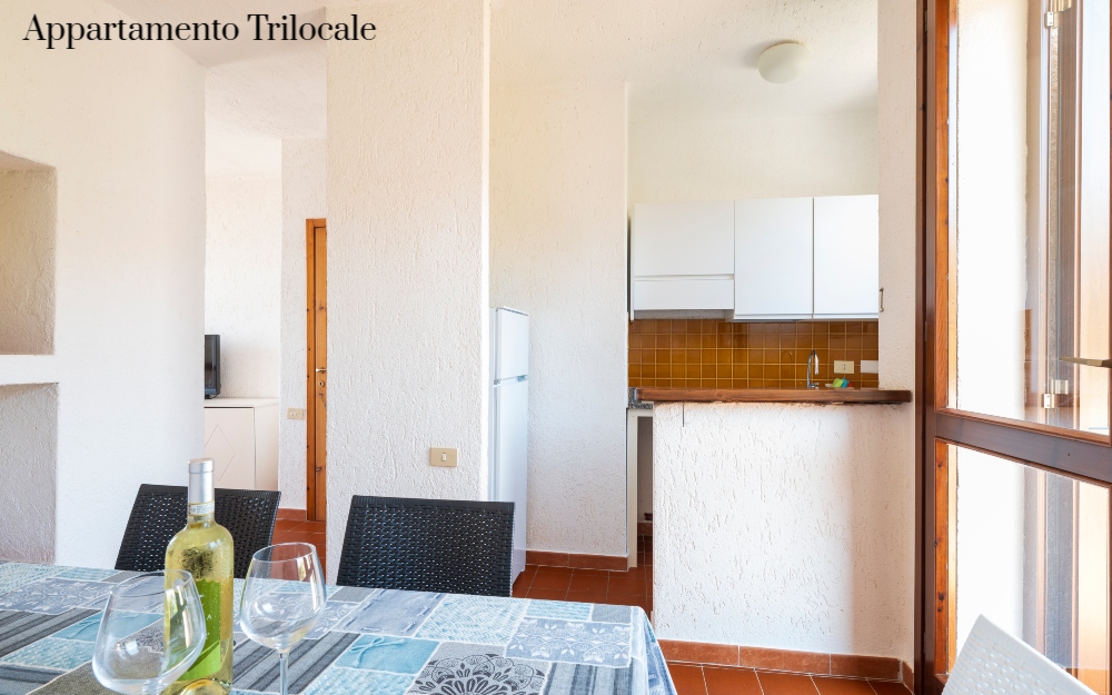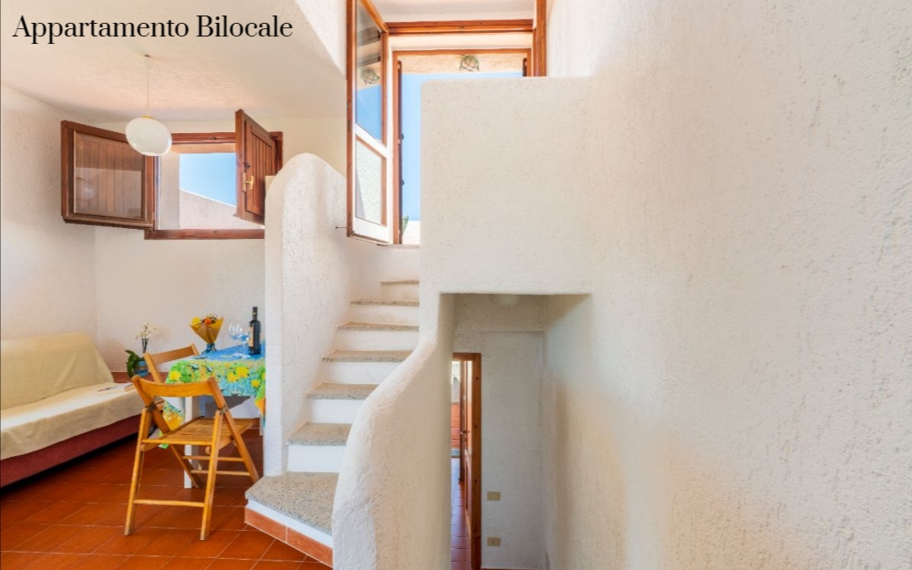 Gli appartamenti sono distribuiti in palazzine a due piani, recentemente rinnovati e ristrutturati, disposti a schiera a piano terra o primo piano ed affacciati sul promontorio Capo Testa. Tutti gli appartamenti hanno ingresso indipendente, angolo cottura attrezzato, lavatrice, TV, camere sempre con letti bassi, patio, balcone o giardino con sedie e tavolo da esterno. I bagni sono con box doccia, water e bidet, dotati di asciugacapelli a muro.