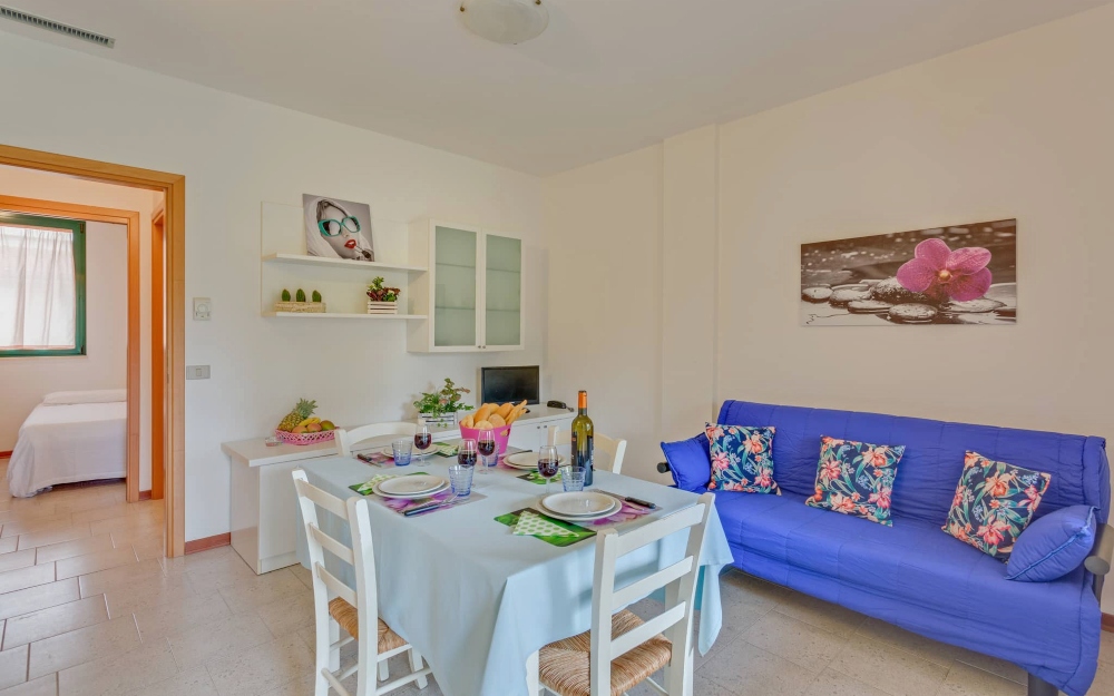 Il Trilocale Premium dispone di servizi privati, aria condizionata, soggiorno con angolo cottura, frigorifero e divano letto matrimoniale, camera matrimoniale, cameretta con letti a castello con sponda superiore anti caduta e veranda esterna attrezzata con tavolo e sedie. Tutti gli appartamenti sono al piano terra rialzato e si trovano nella posizione centrale del villaggio (vicino alla piscina, ristorante, spazio animazione, reception ecc) dove è presente anche il passaggio al mare, che dista ca. tra i 400 e i 650 mt. Sono la soluzione ideale per chi preferisce avere a pochi metri tutti i comfort e i servizi offerti dalla struttura.